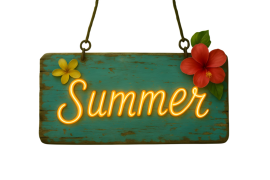 Tropical Summer Sign with Glowing Neon Text on Weathered Wooden Board Decorated with Hibiscus and Plumeria Flowers in a Lush Green Jungle Setting
