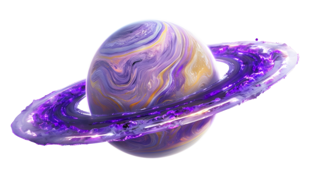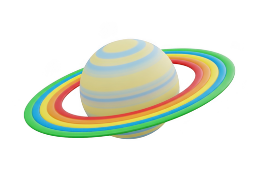 Vibrant 3d rendering of a rainbow-colored planet with rings isolated on transparent background