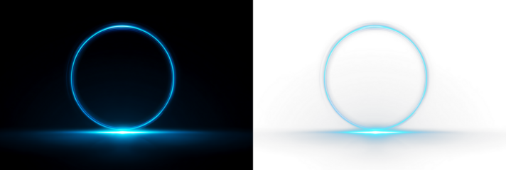 Futuristic blue neon circle frame on light background. Glowing cyberpunk portal ring with electric light effects png