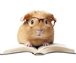 Guinea pig with glasses on an open book isolated on white background. PNG transparent.