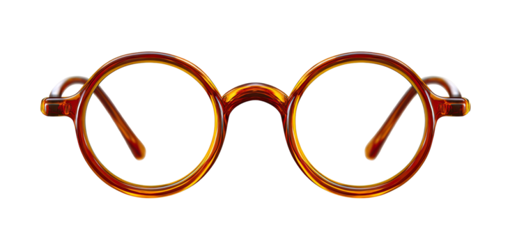 A digitally rendered pair of glasses with round lenses and a dark tortoise shell frame, on black background