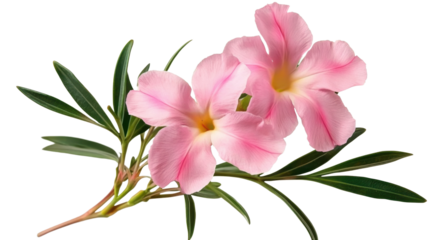 Delicate pink and white oleander flowers with green leaves and intricate roots isolated on transparent background