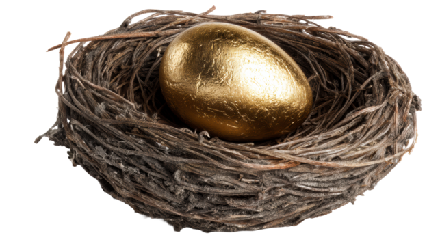 Golden egg in a nest, concepts of wealth, investment, savings, retirement, security, and growing assets