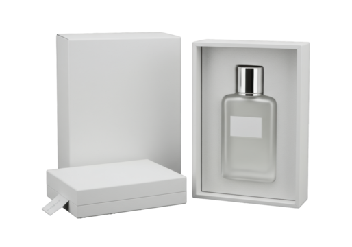 Matte white perfume bottle with shiny silver cap nested in an open luxury box, a closed matching box alongside on a seamless dark gray studio background, concept of minimalist luxury branding