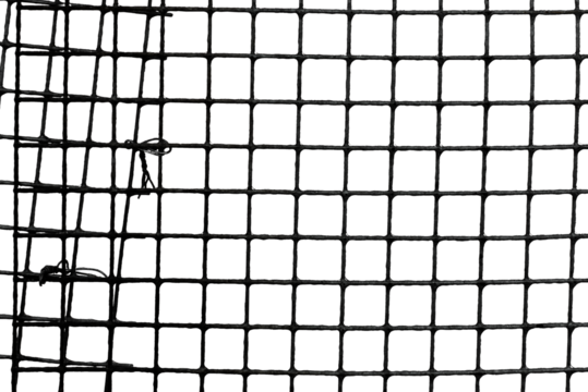 The texture of the metal mesh. Torn, destroyed, broken metal mesh on a white background