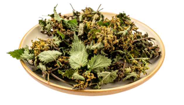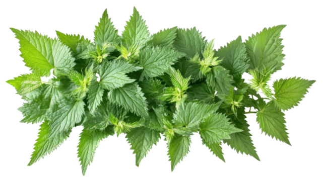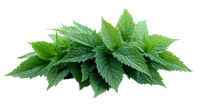 Fresh green nettle leaves piled in a white bowl against a dark black background plant, Isolated On Transparent Background, Png Cut Out