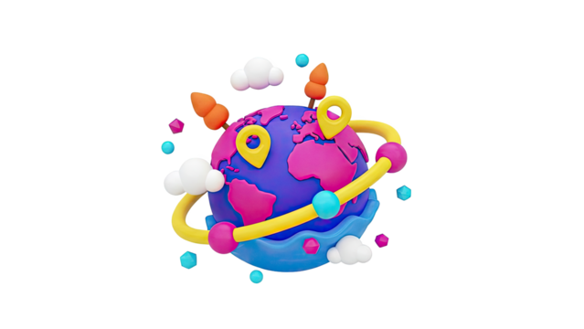 3D Stylized Globe with Location Pins and Abstract Elements on transparent background