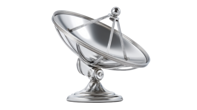 Large silver satellite dish isolated PNG on transparent background, communication technology for space exploration and scientific research