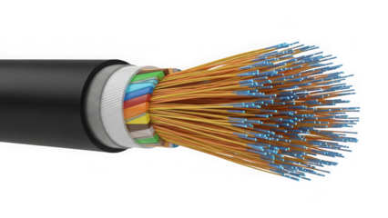 Close-up showcases a network cable, split into colorful strands, bundled and connected with contrasting white and orange casings