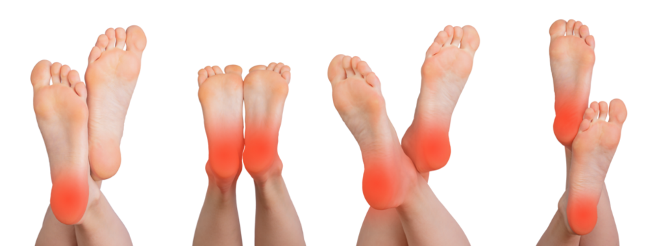 Set of female feet focusing on the heel and sole, highlighting symptoms of pain, soreness, and inflammation. Depicting conditions like arthritis, neuropathy Isolated on white