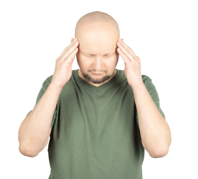 Severe headache and fibromyalgia pain affecting a bald man in a green t-shir