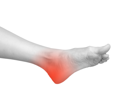 Heel pain, inflamed foot joint with soreness and injury. Chronic arthritis, gout, and neuropathy causing discomfort. Therapy and treatment for inflammation, sprain, and trauma.