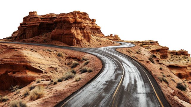 Desert highway through canyon, cut out. Isolated on a transparent background.