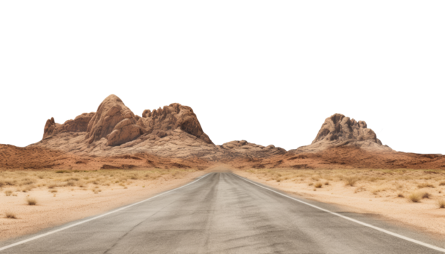 Empty road stretches through a dry desert landscape. cut out, on white background, Clipping path
