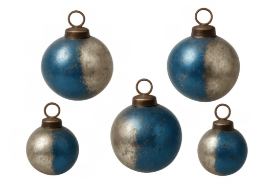 Vintage blue and silver christmas baubles ornament collection with aged weathered texture, isolated on transparent background