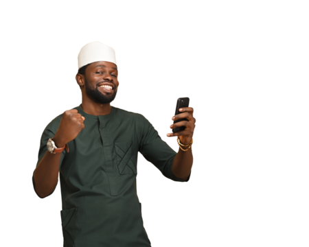 png of An excited overjoyed black man holding a smartphone receives news from a mobile online bet game win, ecstatic african guy looking at his cell phone celebrates receiving reading good news png