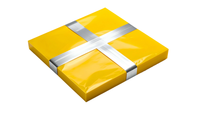 A bright yellow wrapped gift, secured with a shiny silver ribbon, on a black background