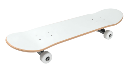 Isometric studio shot of a white skateboard with natural wood accents and black wheels, isolated on a black background