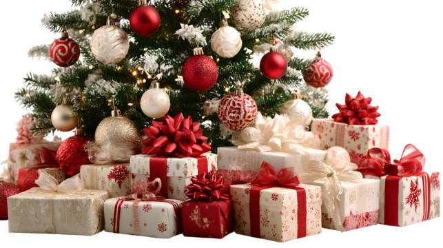 Elegant Christmas tree with sparkling ornaments and large holiday gift boxes placed around isolated on white background
