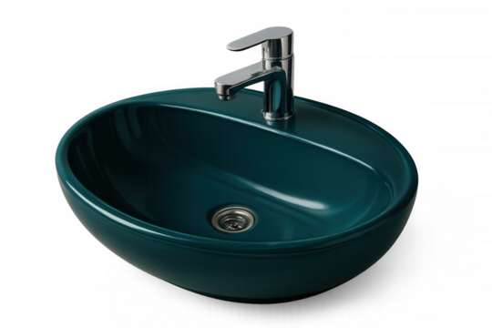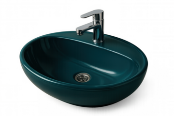 Stylish oval teal washbasin with a shiny metal tap, isolated on a transparent background, perfect for bathroom renovations