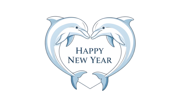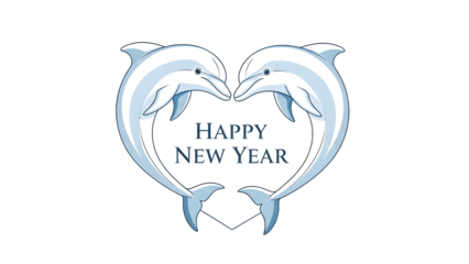 Two stylized white dolphins forming a heart shape with happy new year text inside
