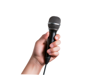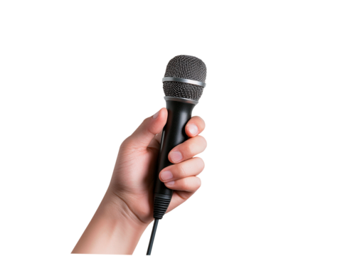 Close up of a hand holding a microphone isolated on white background PNG .AI GENERATED