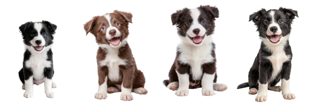 Super adorable black and white Border Collie pup seated up with his tongue out panting. Looking towards the camera with the sweetest eyes. Isolated on a transparent background.