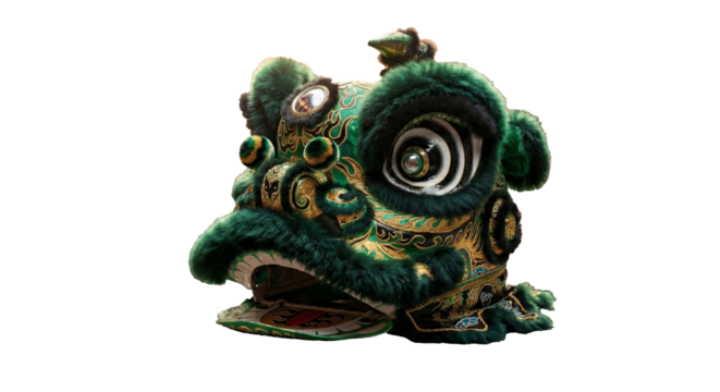 NG cut out isolated background. A detailed, close-up view of a vibrant green and gold Chinese Lion Dance costume head.