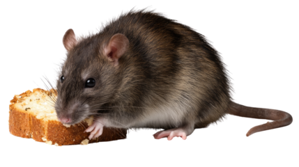 A close-up of a brown rat nibbling on a slice of bread, showcasing its detailed fur and whiskers against a clean white isolated background.