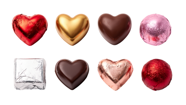 Gourmet chocolate candy set including foil wrapped hearts, spheres, and pralines isolated. Valentines day and luxury confectionery collection.