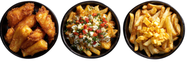 Fried chicken nuggets and french fries with cheese and gravy on transparent background