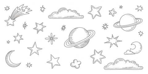 Whimsical hand-drawn space elements collection featuring planets stars clouds and a comet