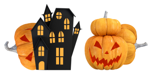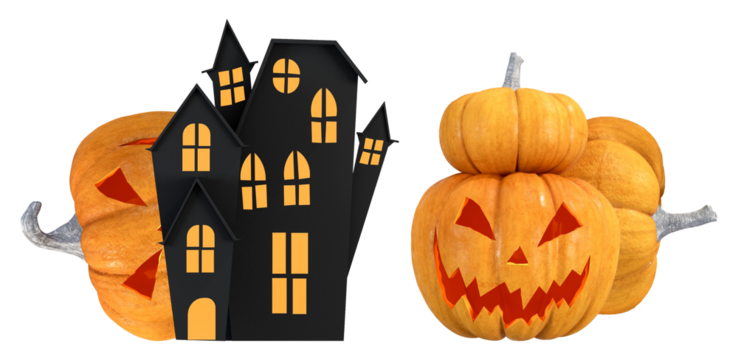 spooky halloween composition with two stacked jack-o'-lanterns flanking a haunted house silhouette.