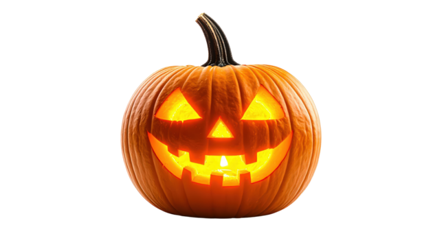 Illuminated Jack-o'-Lantern Pumpkin With Carved On Black Background For Halloween Holiday Decorations And Spooky Theme Designs