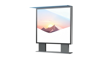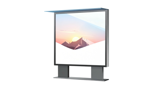 A digital billboard showcasing a mountain landscape with a setting sun