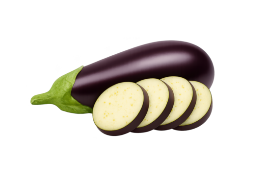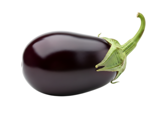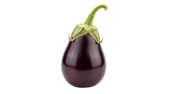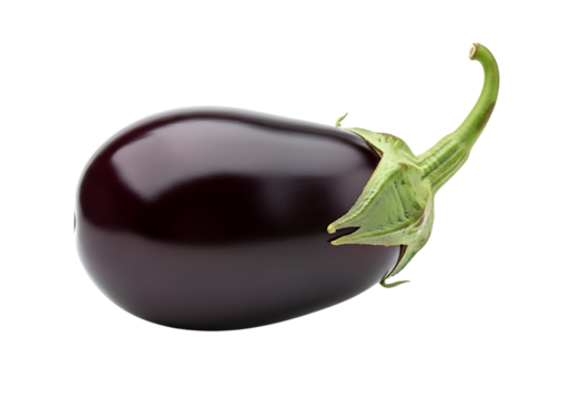 A single, ripe eggplant, isolated on a transparent background, showcasing its vibrant purple skin and green stem. background removed