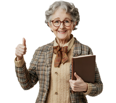 A grandmother pointing her finger up while holding a book on a transparent background. Cutout. International book day concept
