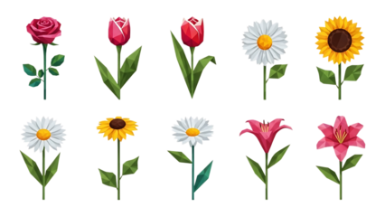 Nine colorful flowers isolated on transparent background