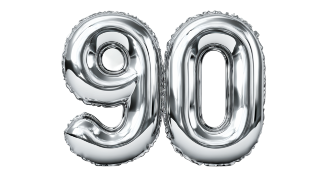 Shiny silver foil balloons forming the number ninety perfect for celebrating a 90th birthday anniversary or significant milestone occasion celebration.