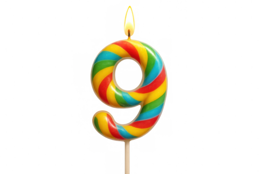 Glowing golden birthday candle number nine illuminating transparent surface, celebrating ninth year milestone