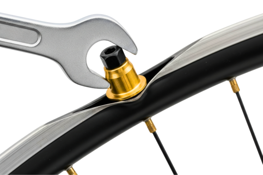 Silver wrench tightening a small gold spoke nipple on a bicycle rim on a transparent background