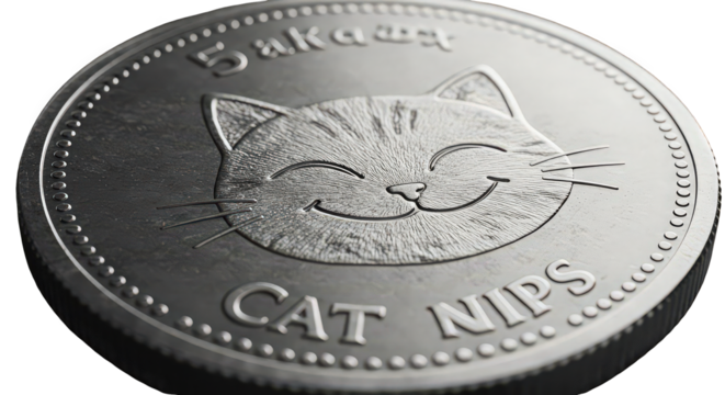 Close up of a silver coin with a cat face and the words cat nips engraved on it in a dark setting