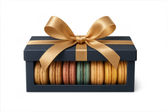 Colorful french macarons gift box with golden ribbon