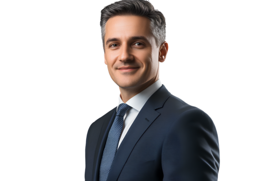 Portrait of a man dressed as an executive at his office job, isolated image with no background in PNG format