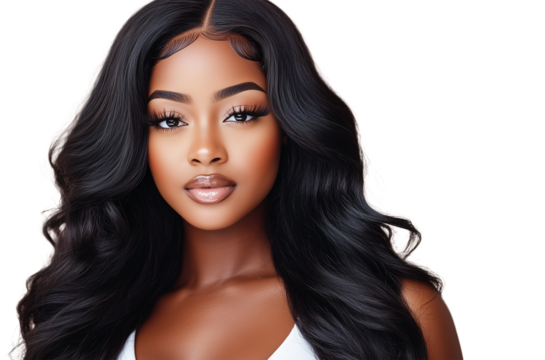 Portrait of Elegant Black Woman with Long, Wavy Straightened Black Hair, Nude Makeup, Lashes Extension, Glamourous and Sensual African American Female, Transparent Background.