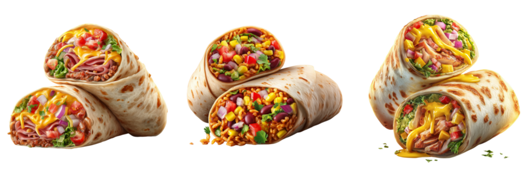 Three different burritos filled with meat vegetables and cheese isolated on a transparent background