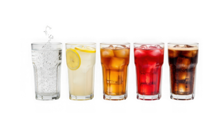 Refreshing brown fizzy soda beverage filled with clear ice cubes in a transparent glass, isolated on a black background, PNG image, PNG file.