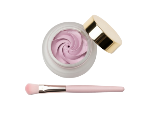 Isolated pink swirl cream in jar with gold lid plus pink applicator brush on no background