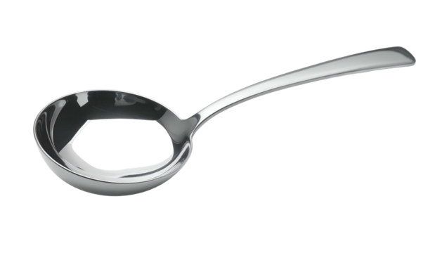 Shiny, silver ladle with hexagonal cutout in the bowl
