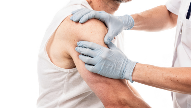 Softfocused image of healthcare professional examining axillary lymph nodes on partial torso of adult patient seated for immune recovery check in a clinical setting.